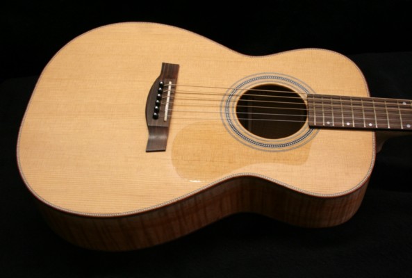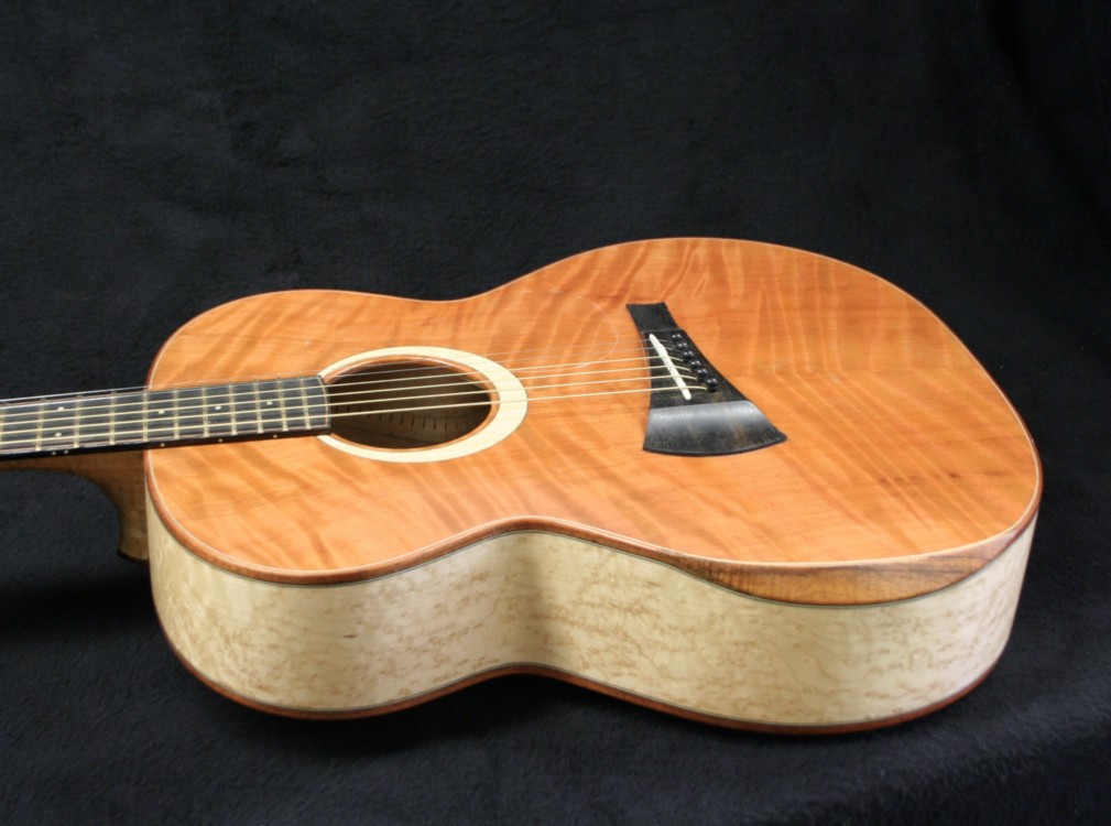 With the onset of the initial pandemic ‘lockdown’ I decided that it would be a good time to build another acoustic to trial some new to me, timbers and techniques. The ‘trial’ timber was to be curly redwood that I had used on a number of electric drop tops but never on an acoustic. This would be paired with some rather lovely birdseye maple back and sides that I had had for a number of years. Bindings would be Koa as would the headfacing of the headstock to match a Koa arm bevel. The birdseye maple would also be used for an offset soundhole rosette. The build was pretty straightforward. I used my “hybrid” style of bracing of torrefied spruce, coupled with an ebony bridge, the design of which I had been playing about with for a number of years. I decided on a rather standard slotted headstock but I did add a koa plate to the back as well as the inlaid front.
