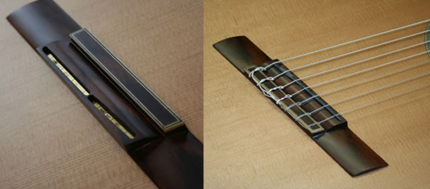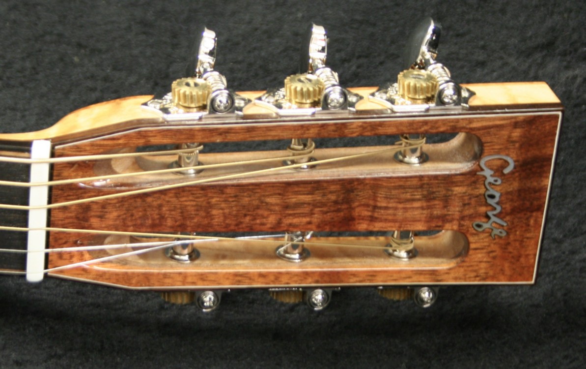 As it was to be a stage guitar, the body depth was reduced to help limit feedback and a ‘Fleta’ style bracing adapted to the cedar top. The back and sides were Indian Rosewood and the neck was mahogany with a Macassar Ebony board. The bridge, also Macassar Ebony, was fitted with two piezo under-saddle transducers, one for the three bass strings and the other for the four treble strings and they were routed through a stereo output jack socket, the idea being that the bass strings could be sent to one amp and the treble to a second amp.