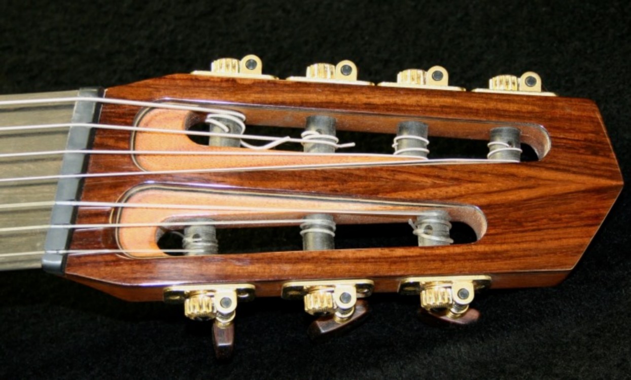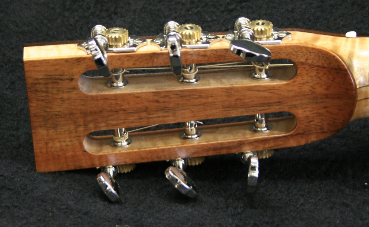 The body shape I based on another guitar that I had built for Dave, a slightly Maccaferri influenced cutaway body with headstock featuring unmistakable Maccaferri routs. There were many long ‘moments’ during the build, when a two dimensional drawing seemed at odds with a three dimensional model but all were overcome and the result really pleasing - mind you I could never play it! The longer bass scale length allowed the bottom string to be lowered to A if needed and the balance across the guitar was excellent acoustically. So far I have yet to hear Dave play it live but look forward to the stereo spread. Now I’m dodging any more No 7 buses.
