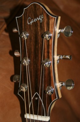 The macassar ebony fingerboard was bound but rather than with contrasting wood/plastic I used the same macassar ebony, this gives the look of an unbound board but without any fret ends showing, it’s something I particularly like and in keeping with the ‘vibe’ of the guitar. The headfacing, also of macassar did get a little more ornate with a light coloured purling line set just inside the bindings.