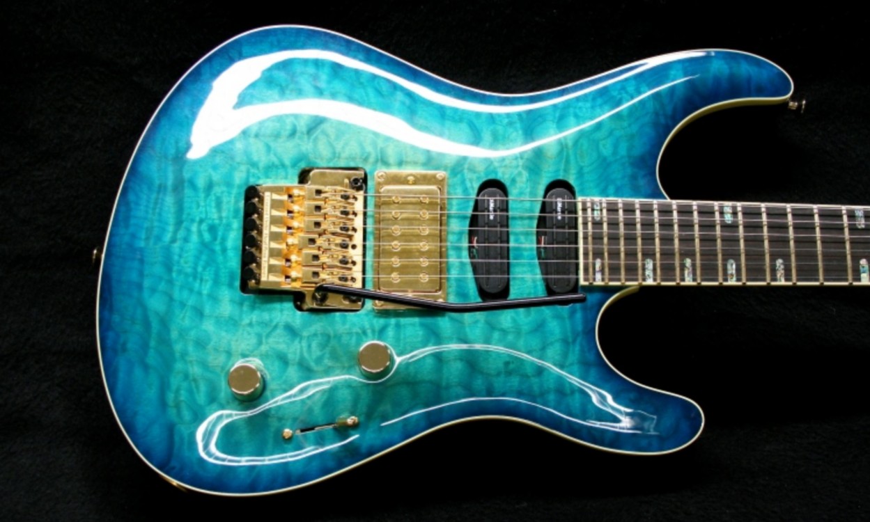 They never are as straight forward as one first assumes. This was to be a carved top, double cutaway, set neck, three pickup electric. The body shape was a combination of a Carvin CT624 and an Ibanez JS2400. We played about with various options, particularly the two 'horns' before settling on the final shape. The top carve was to be more PRS than Carvin and was something I looked forward to, especially as it was in my favourite material, quilted maple. All hardware was to be gold plated where available, and the jewel in the crown was an Ibanez edge low profile Floyd Rose floating trem. First hurdle was to find a gold plated one. Ibanez uk importers refused to sell me one, although if I'd lied and said it was a replacement on an Ibanez guitar, I would have been able to have one! Finally I contacted Thomann, and although it didn't appear on their web site, they said they could obtain one in gold. (I've always been very impressed with Thomann - really excellent, fast service)