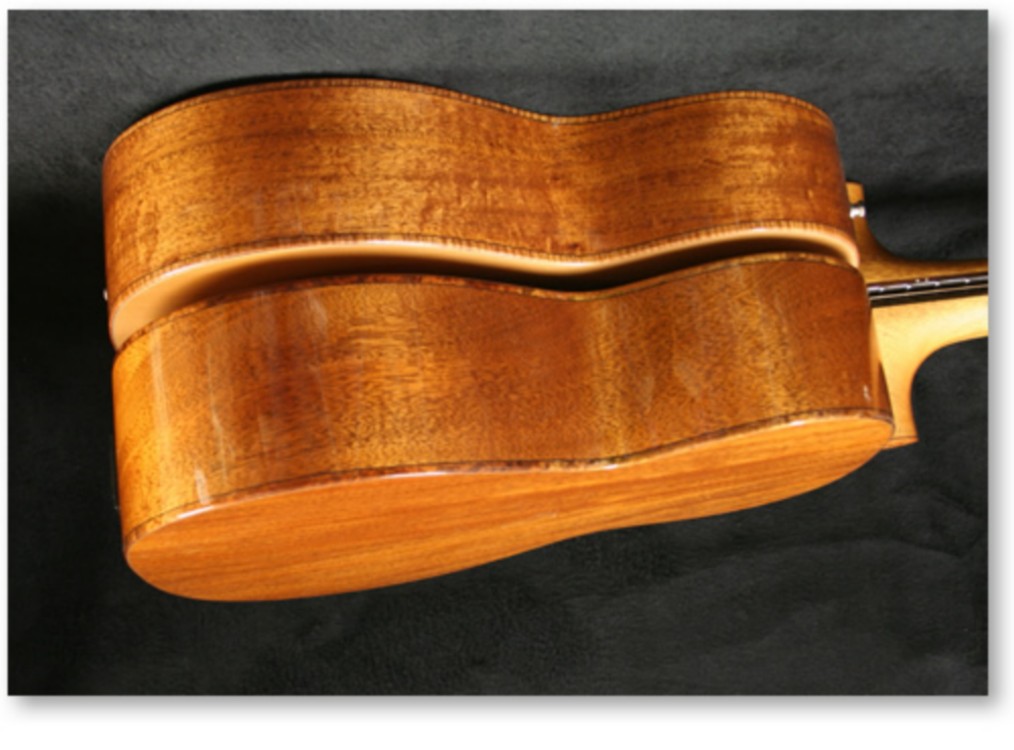 The back and sides were amazaque (also known as ovangkol), the top was sitka spruce and the neck, mahogany. The bridge, fingerboard and head facing were macassar ebony. I decided on a pinned bridge, although most 'real' cavaquinhos seemed to have 'tied' or string through bridges. With steel strings an octave higher, albeit with a short scale, I thought a pin bridge would be stronger.