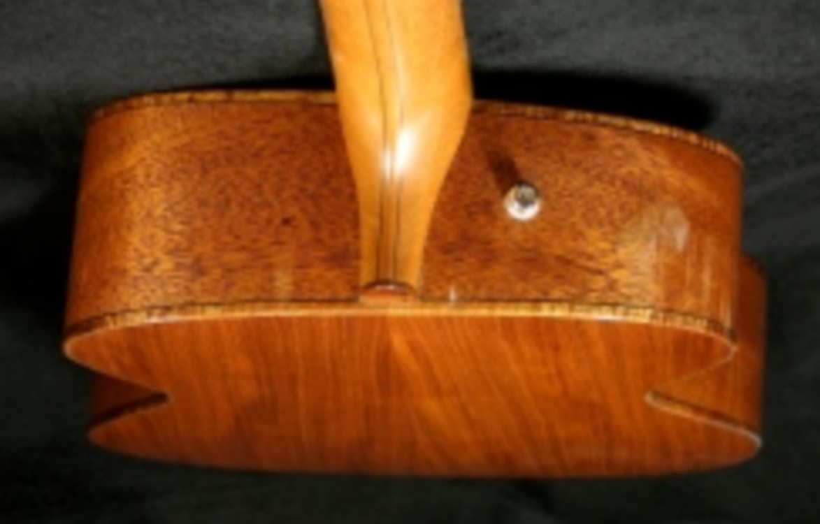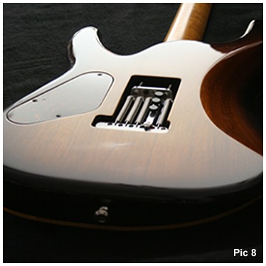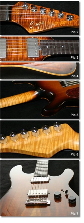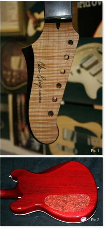 I'm now really pleased that I couldn't talk Colin into one of my 'bursts' on the top and my, did I try. It has a nice 'honey glow' that is reminiscent of a Rickenbacker Mapleglow finish and I love it. The back, sides and neck were finished in cherry lacquer, all gloss apart from the back of the neck which had a satin finish.(PIC 2)