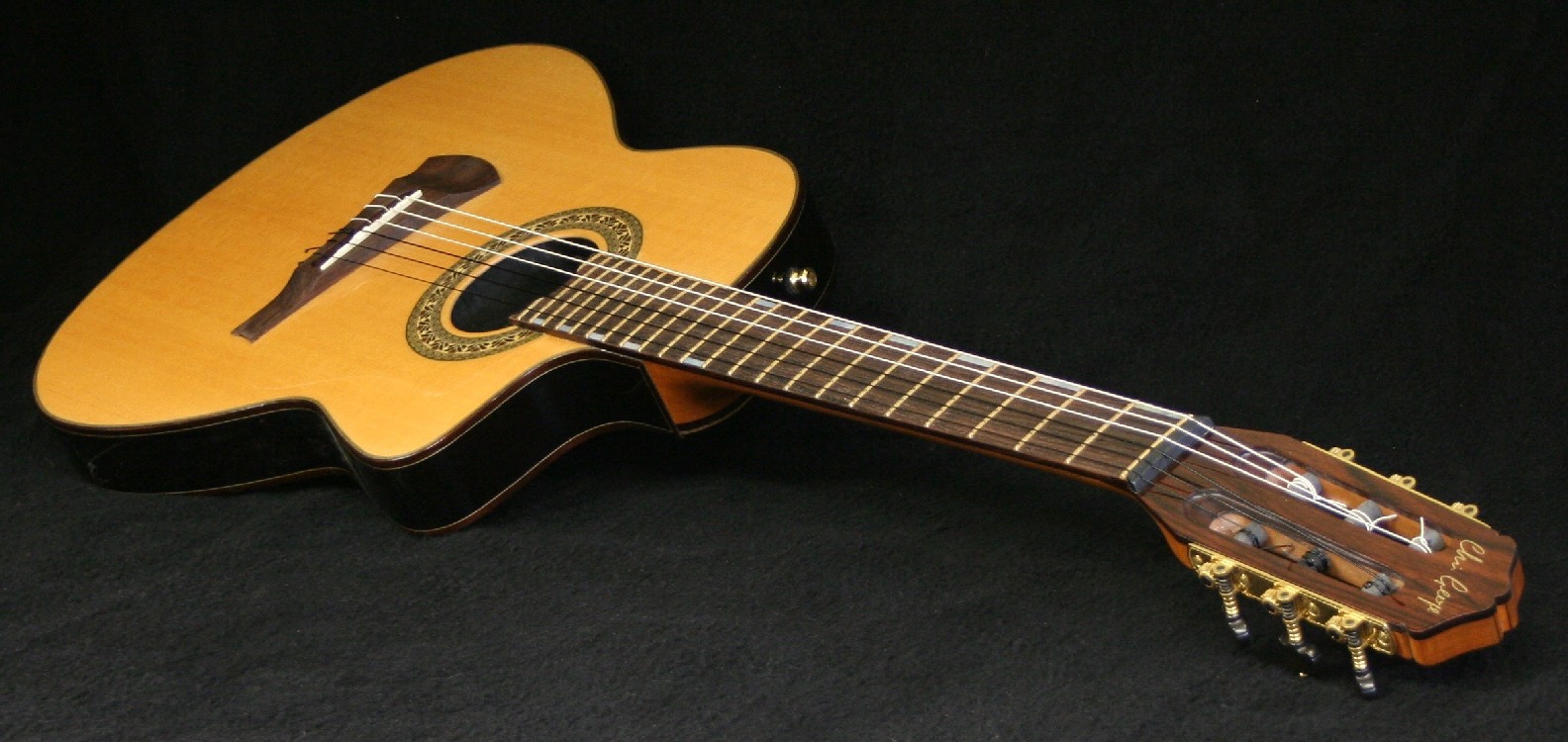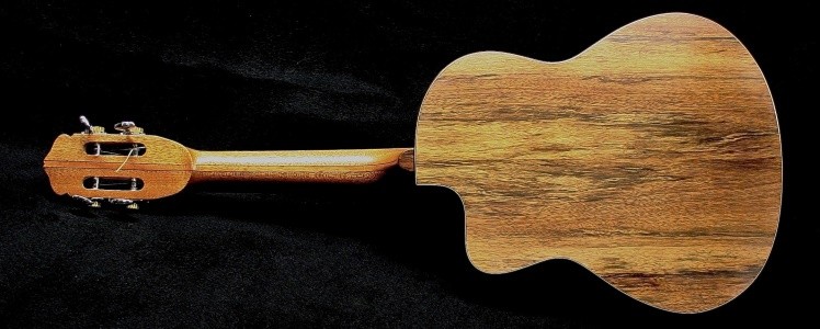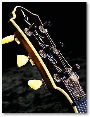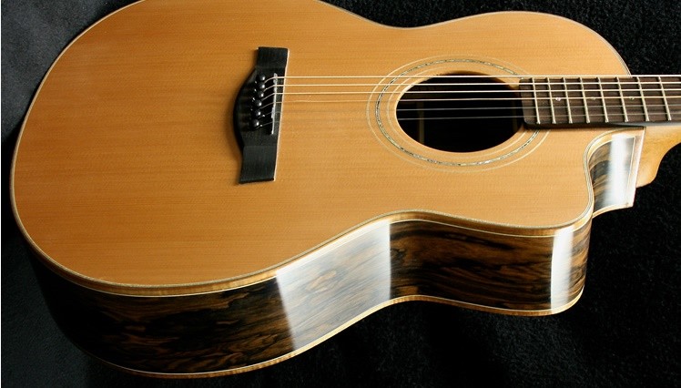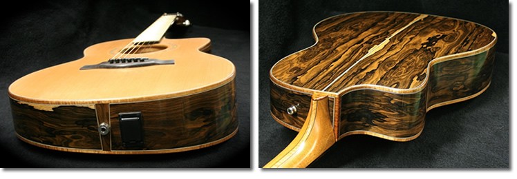 Chris chose ziricote for the back and sides and cedar for the top and binding to body and head were koa. The neck was mahogany with a figured maple centre splice. Fingerboard and bridge were macassar ebony. Ebony bridge pins, Waverly tuners, Schaller strap locks, black tusk nut and bridge saddle and an under saddle B Band pickup system completed the spec.