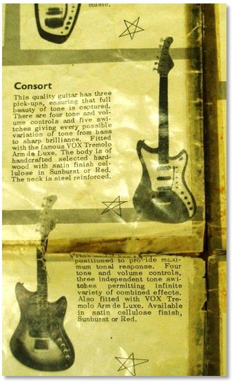 Ian duly arrived with an old 60's Vox handout held together with yellowing sellotape. It showed a five centimetre tall, grainy shot of a heavily Fender Strat/Jaguar influenced guitar. Not the prettiest beast I had ever seen and sporting a headstock that looked as though designed by Salvador Dali.