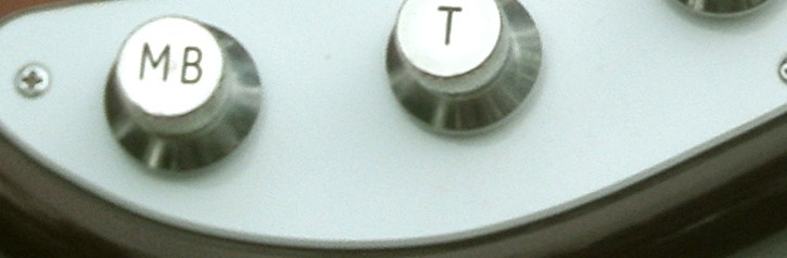 I had decided to use a 5 position rotary pickup selector switch with a chicken head knob for the Lollars, in keeping with the vibe, but instead of the obvious Strat type combinations, I opted for bridge only, bridge and middle, bridge and neck, middle and neck and neck only- the bridge and neck option being my favourite sound from a Tele. I wanted the controls to be simple with one volume and one tone control for the Lollars but I did equip the tone control with a push/push switch to change the capacitor value from 0.015 to 0.047. The volume control also had a switch inside the control cavity, which could switch in or out a treble bleed capacitor as I wasn't sure which I would eventually prefer. The Baggs had a volume control for use when outputting in stereo and this would act as a pan control in mono mode. A discrete switch on the back of the control plate will select mono/stereo mode.