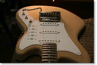 These were the words that convinced me that I had to build this guitar. Let me explain. I had received an email from a guy in Texas who was enquiring about a custom "T" type guitar with both regular pickups and Variax electronics. It was at the time when the British pound was worth two US dollars. I roughly priced up the guitar and suggested that the prospective customer seek an American builder as it seemed to me that every third person in the States was a luthier and this guitar would be considerably cheaper if it was built over there. That's when I got the reply, "Well I guess I only know those other two guys". I just knew that we would get on.