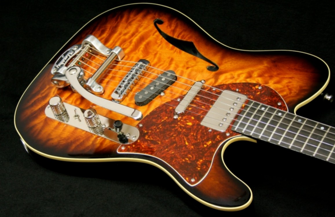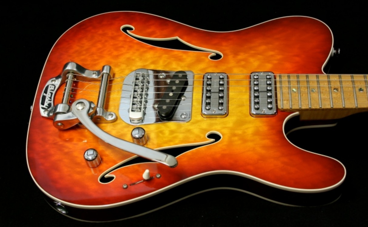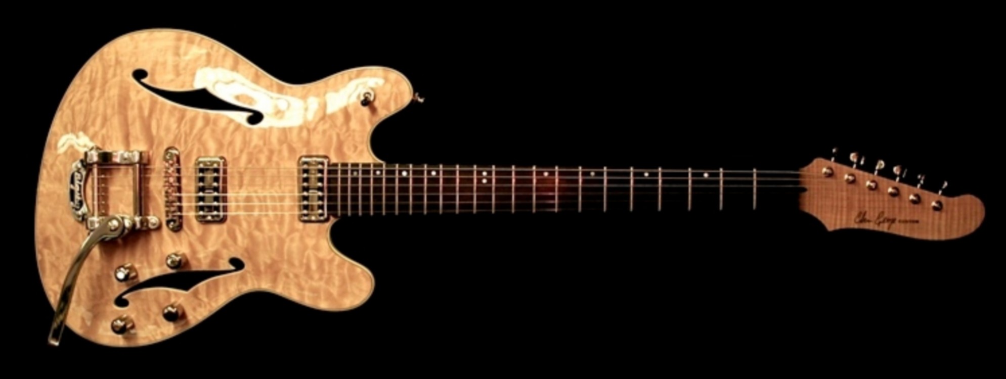 The "Splitguard" featured here was commissioned by Colin, who previously had a 'StarMaster' built (Featured build 5/2011) The spec was very much a set neck 'T' type thinline with single 'f' hole. Quilted maple top over a hollowed out mahogany body. A flamed maple neck, capped with an ebony board and the headstock a cross between my 'StarMaster' and a regular 'T' type and with the concave chamfer. A separate quilted maple headfacing was added to match the guitar's top.