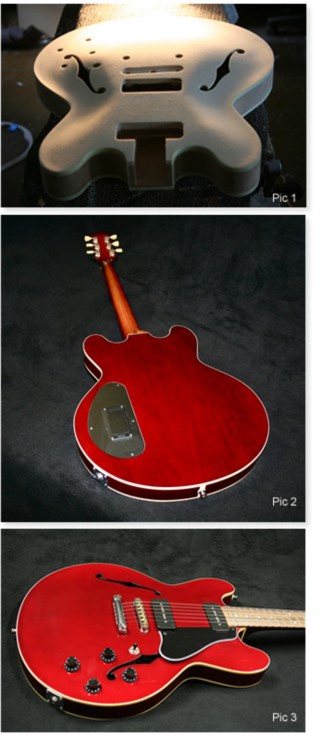 The top was hand carved out of European spruce, although at one time it was going to be mahogany. Two unbound 'f' holes were added (or should that be subtracted) and once the outside was carved the inside was hollowed out, not as thin as in an archtop jazzer but about 1/4" thick apart from the bridge and neck blocks. (PIC 1) The body was routed out only leaving the back, walls and matching bridge and neck blocks. The neck was my now, usual triple spliced mahogany with carbon fibre bars and two way truss rod with a slight vintage vee profile. As Steve wanted a double bound body, it wasn't my heeless design but rather a traditional heel with a macassa ebony heelcap to match the unbound fingerboard. Steve wanted a red wine, rather than cherry finish to the body, the neck having a slight hint of tobacco and the back of the neck was satin, whereas all other was nitro gloss.(PIC 2)
