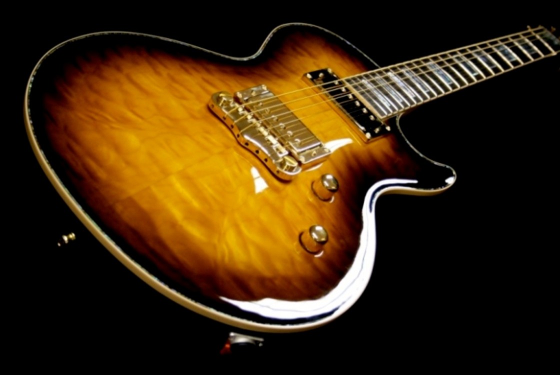 The guitar is finished in nitro cellulose lacquer and I mixed my own gold after experimenting with three different bronzing powders. The rest of the guitar is finished in my favourite "Tobacco burst".
