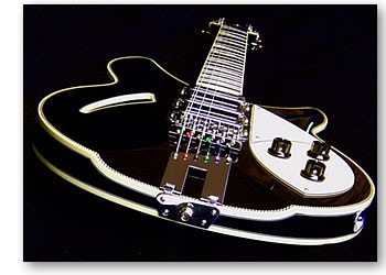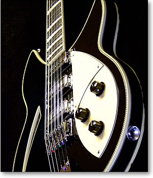 We decided on a model 360/12"Ric" type (more Harrison than Lennon) with three toaster top pick ups and a 5 way selector giving the nice acoustic-ish positions 2 and 4 rather than the piezo bridge system. All hardware was to be chrome with cream bindings and scratch plate. Black nitro cellulose finish set off with fine black/white linings to the sides, back and neck and black and white herringbone purfling to the front. The ebony fingerboard with real Mother of Pearl inlays completed the spec.