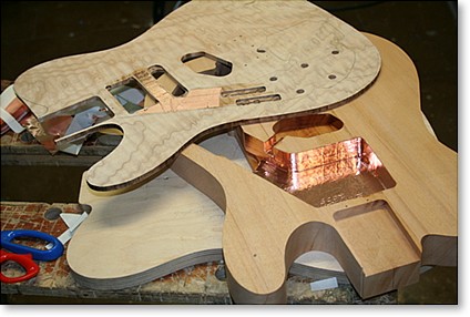 Erin shipped his Line 6 Variax guitar and three Seymour Duncan pickups to me and work began. I had some stunning quilted maple for the top and decided that because the wood was so striking, I didn't really want to use any pickup surrounds. I decided that I could 'tunnel' the neck and middle pickups into position through the main electronic control cavity, after the maple top was glued to the mahogany body. This 'tunnel' was also copper foil shielded before gluing, as it would be impossible to do it later on.