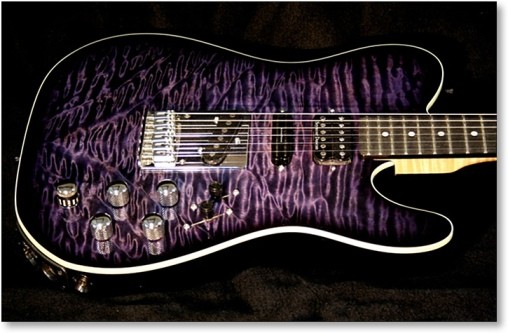 The spec. was a 'T' type guitar with a mahogany body, a bound top and no pickguard. It was to have a quilted maple, bolt on neck with ebony fingerboard, mother of pearl position dots and dual outputs for the magnetic pickups and Variax electronics. Literally two guitars in one, it would be a Variax and regular guitar, each with its own controls and switching systems. An outboard A/B pedal would select which "guitar" would feed the amp. Oh yes and it had to be purple!