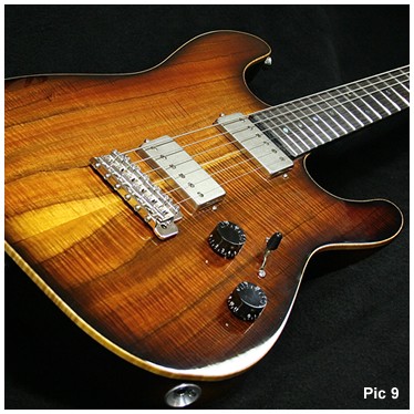 Figured ebony head facing with pearl inlay. Bocote inset truss rod cover