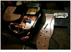 The end result bought nice comments from folk who wandered into the workshop. I must say I was chuffed with the colour but only got one chance to play it in earnest at a 'Rocket' rehearsal. The LR Baggs bridge and preamp always amazes me with it's sound. The Low Wind Lollars are more gentle than a standard P90, more towards Fender than Gibson to my ears but the real pleasure is having piezo and mags on together into two amps and blending the mags into the piezo mix via a foot volume control but then I've always been an acoustic folky with rock ambitions at heart. (PIC 3)