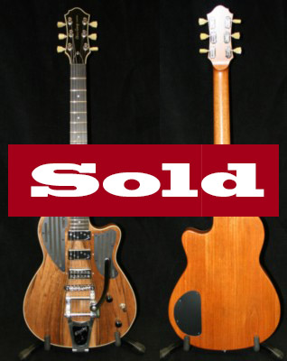 | COMMENT | Really lovely Gretsch type guitar, It is a set neck although from the back it looks like a neck through body. Ebony headfacing, pickguard and arm rest. It was featured in Guitarist mag March 2012 and on the front of their 2013 calendar, There is also a sound clip of it being demonstrated by I think Mick Taylor of Guitarist somewhere on Youtube. |