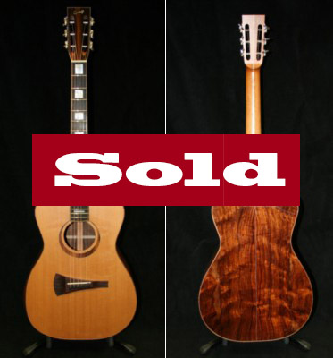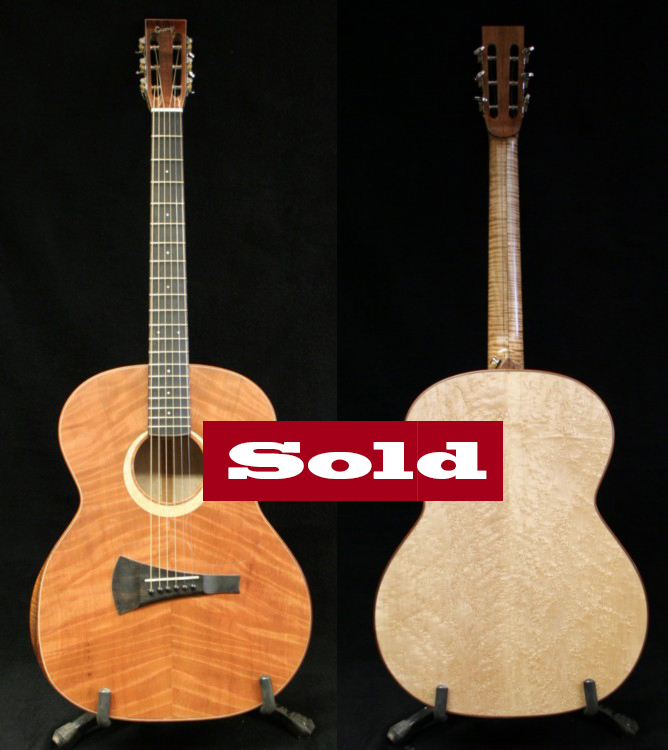 Curly Redwood top, Birdseye maple back and sides, Koa binding and bevel |